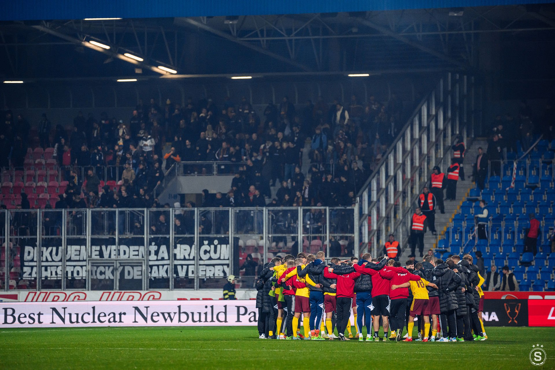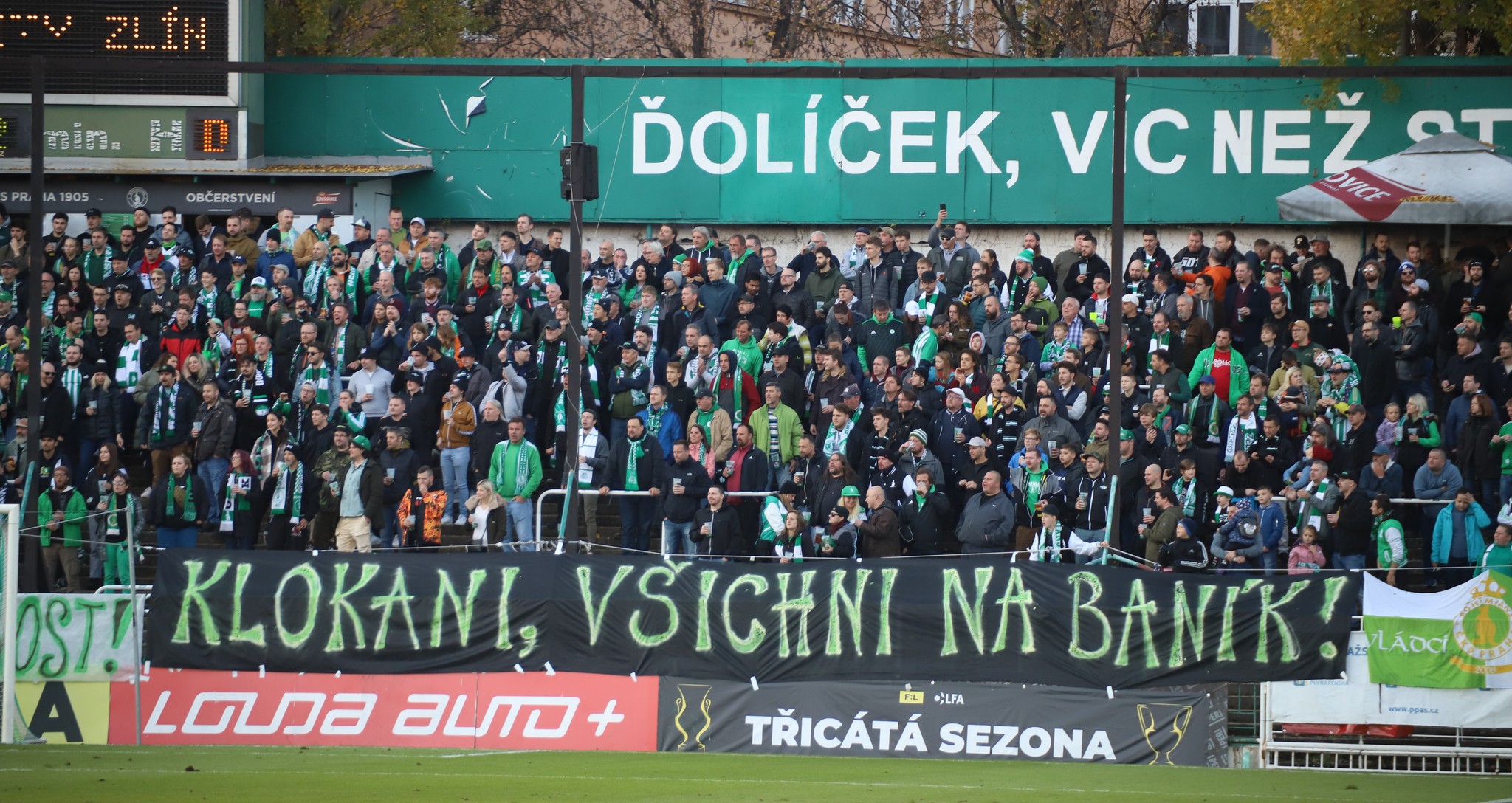 "Samotná prezentace na utkání nebyla, ale zato jsme si připravili několik bannerů směrem k výjezdu na Baník a komunikovali s klubem jejich prezentaci v prostoru uzavřeného sektoru C, aby byl text dobře čitelný z kotle i hlavní tribuny. Před utkáním naši práci zhlíží SLO a v záchvatu paniky běsní, ať nápis okamžitě odstraníme. Nevidíme k tomu důvod, promo výjezdu na Baník by přeci mělo být zájmem nás všech. Ovšem moralistickým hyperkorektorům z řad klubu se nepozdávalo sprosté slovíčko ve sloganu "PŘEKONEJ LENOST, JEBEJ VZDÁLENOST". Snad, že by způsobilo fatální katastrofu jejich skvělému klubovému PR a vysílají security, aby banner z céčka urychleně odstranila. Po této komediální akci nakonec bannery vyvěšujeme na plotě v kotli a na céčku tak zůstává pouze "SOBOTA 12.11. SRAZ 9:30 HL.N."