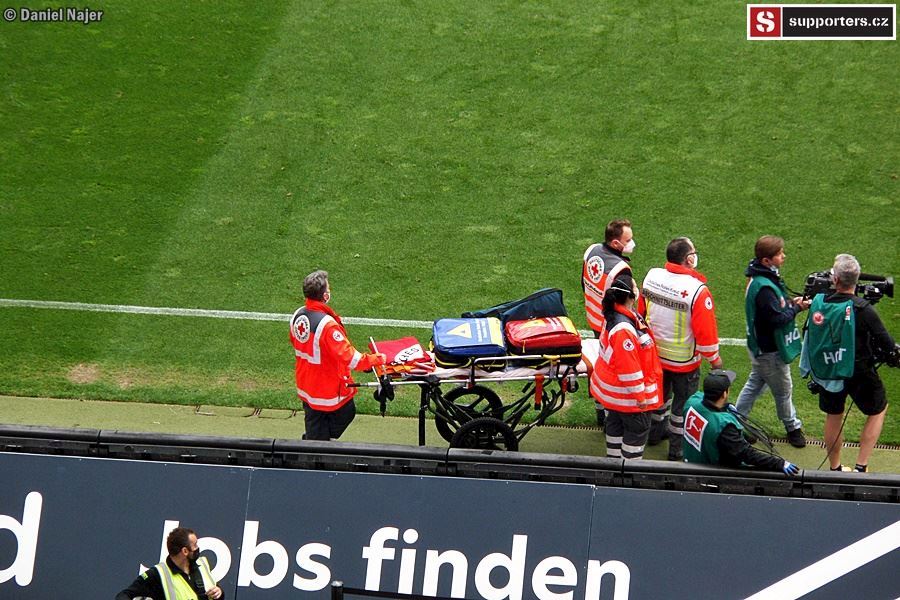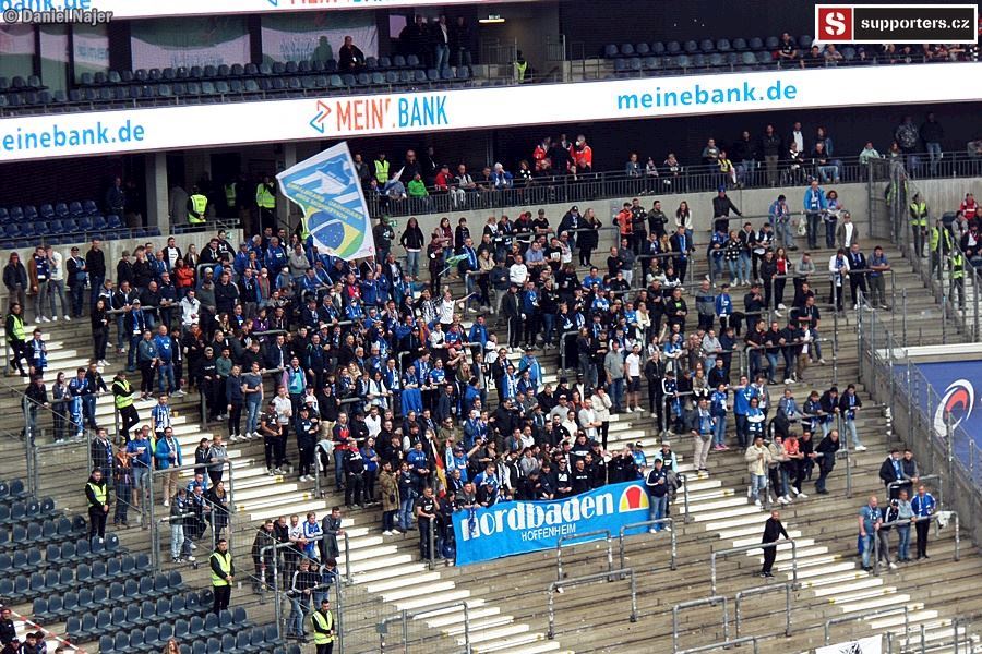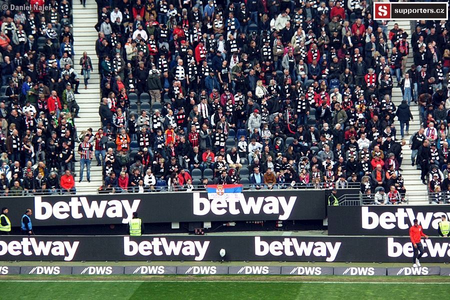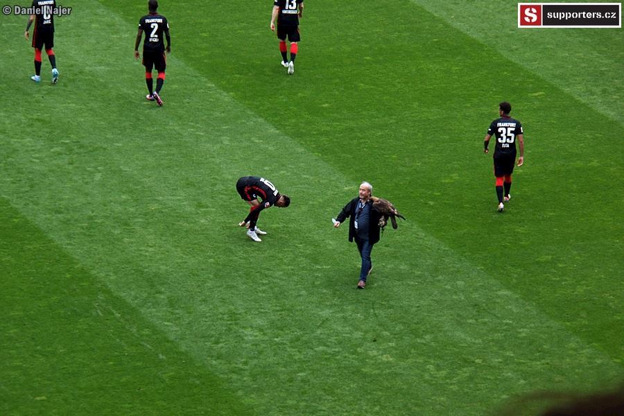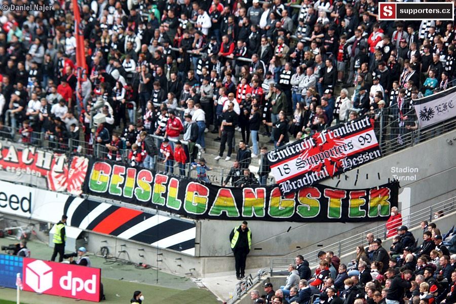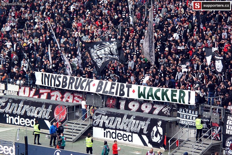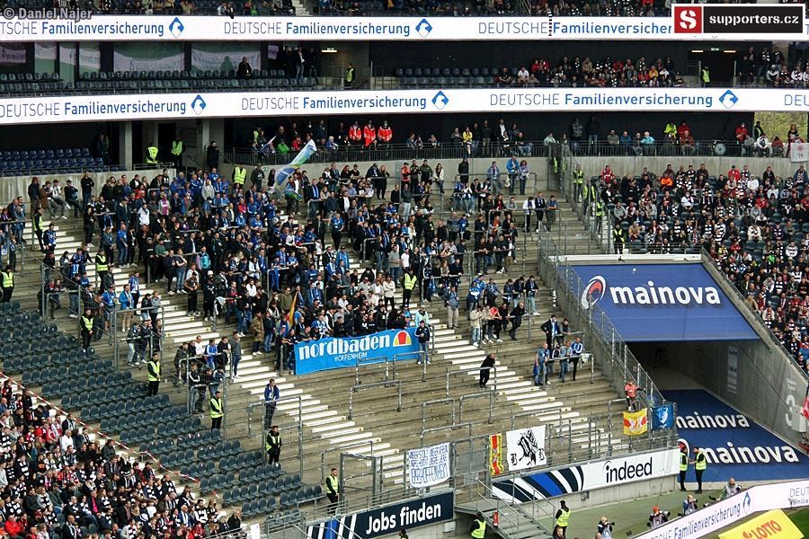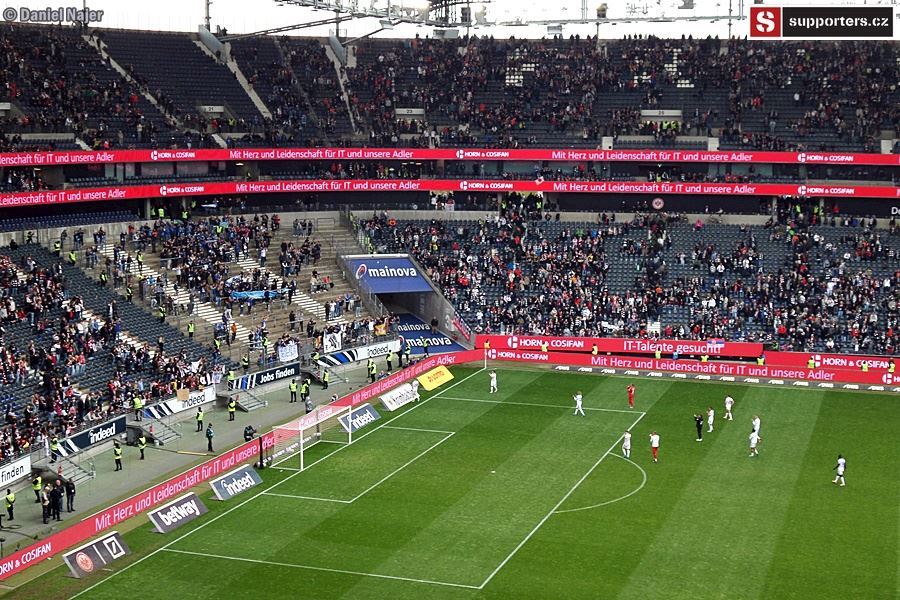 Co se týče zápasu, domácí kotel žhavil hlasivky hned od začátku, pěkně do toho šlapal. Hostující fans se také snažili, ale na mohutnou převahu domácích neměli. Sektor hostů byl zaplněn tak z jedné třetiny, jak je vidět na fotkách níže. I tak podporovali svůj tým a když se po 12 minutách dostali do vedení díky vlastní brance domácího hráče, byli ve varu. Za pár minut ale tentýž hráč trefil správnou branku a bylo vyrovnáno. Do kabin se šlo za vyrovnaného skore 1:1. Po poločase šel do vedení Eintracht, 12min před koncem ale hosté vyrovnali na konečných 2:2. Během zápasu se v domácím sektoru objevilo 4x pyro, vždy 2 až 4 světlice. Pořadatel upozorňoval na zákaz používání pyrotechniky a k mému překvapení se ozývalo i bučení, když se opět nějaký ten oheň objevil. Asi to byla daň za místa, nejdražší na stadioně, možná suchaři okolo nebo pod námi (tam ale bylo vipko, hmm...). Tak či onak, kotel domácích hodnotím kladně, i když do toho mohl dát určitě ještě trochu víc. Možná únava po zápase Evropské ligy nebo šetření se na zápas v Anglii.