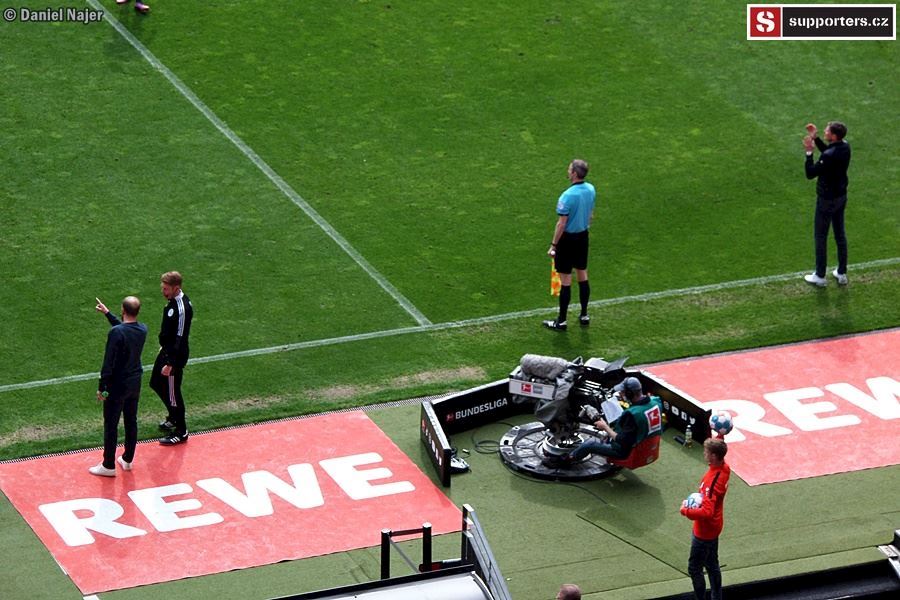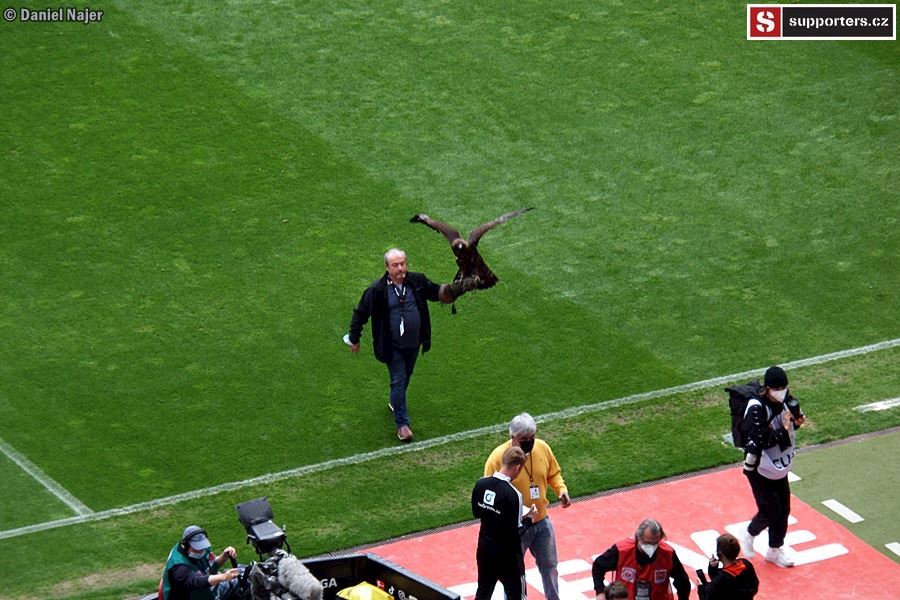 Jelikož jsme ráno nesnídali, bylo třeba se před zápasem posilnit. Trochu překvapení, že na pití a na jídlo se stály 2 fronty. Jeden stánek jen pivo či nealko, další jen jídlo (bratwursty, hranolky, currrywurst). U piva jsme se nezdrželi dlouho, do 10min hotovo. Abychom nestáli frontu za chvíli znova, tak jsme využili jakési tašky a koupili 4 piva a dali je do nosiče (tašky) a šli čekat na jídlo. Tam už to tak svižné nebylo a 30min jsme si tam postáli. Front bylo u stánku několik (4 určitě, možná 5). Najedli jsme se a doslova sprintovali do sektoru. Lupeny byly na hlavní, nad VIP, nad lounge, kousek pod média. Takže pěkně po schodech až nahoru. Přicházíme do sektoru a akorát nastupují hráči. To bylo tak tak... ještě vidím orla na ploše (Adler). Výhled byl vynikající.