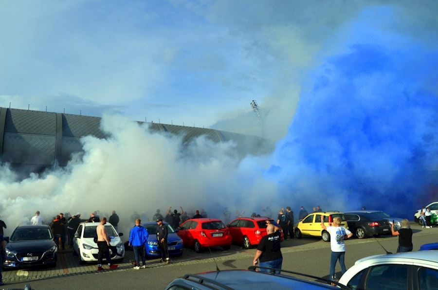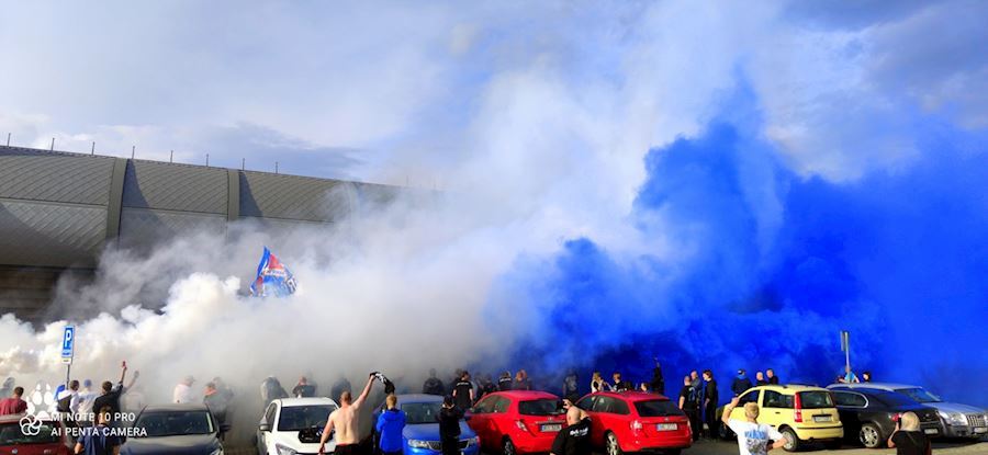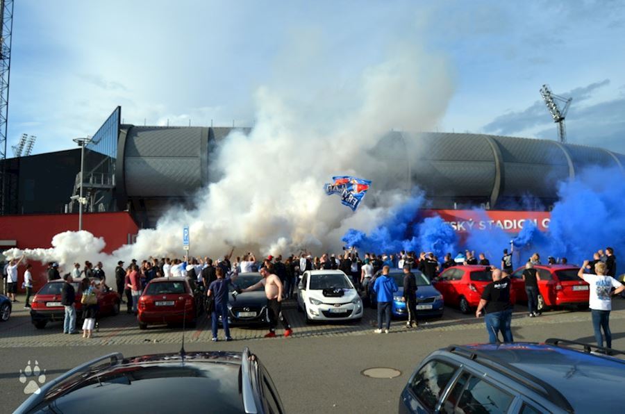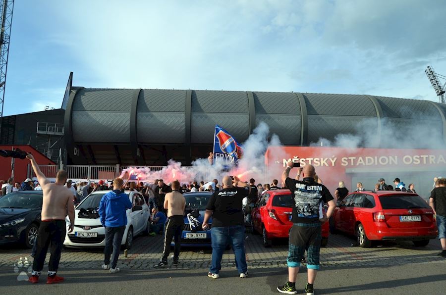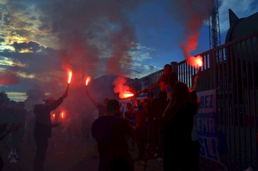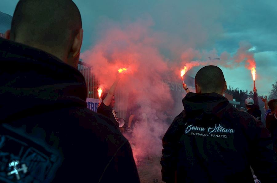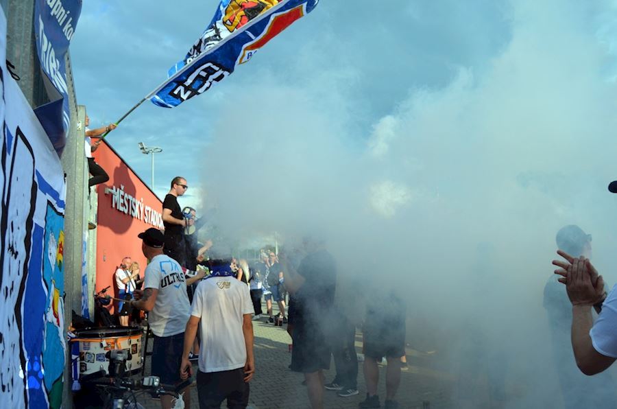 Fanoušci ostravského Baníku dodržují tradici a i v zápase se Zlínem se sešli před ostravským stadionem, kde podporovali svůj tým, který nakonec zvítězil 3:2. Vůně pyrotechniky u toho nemohla chybět...