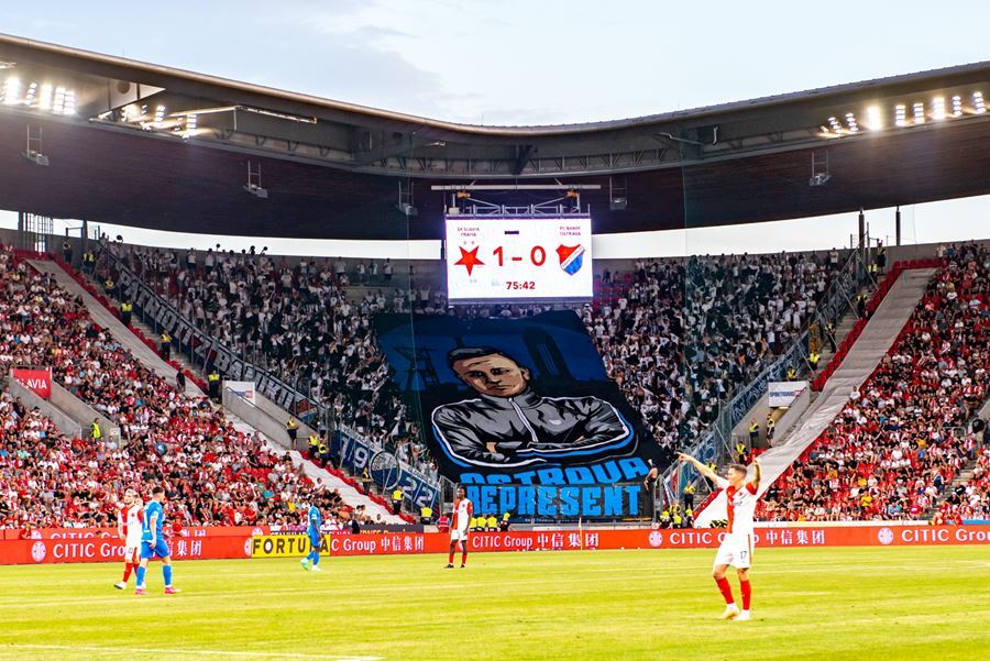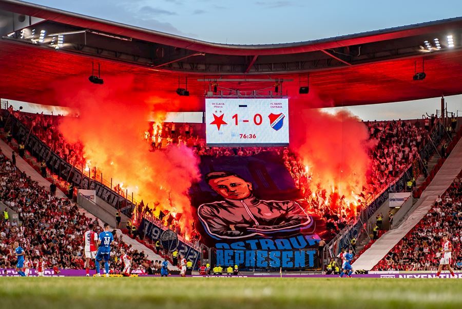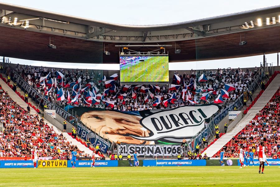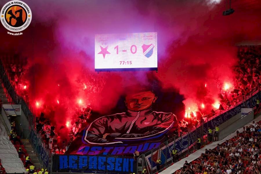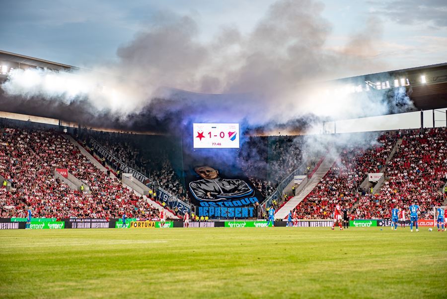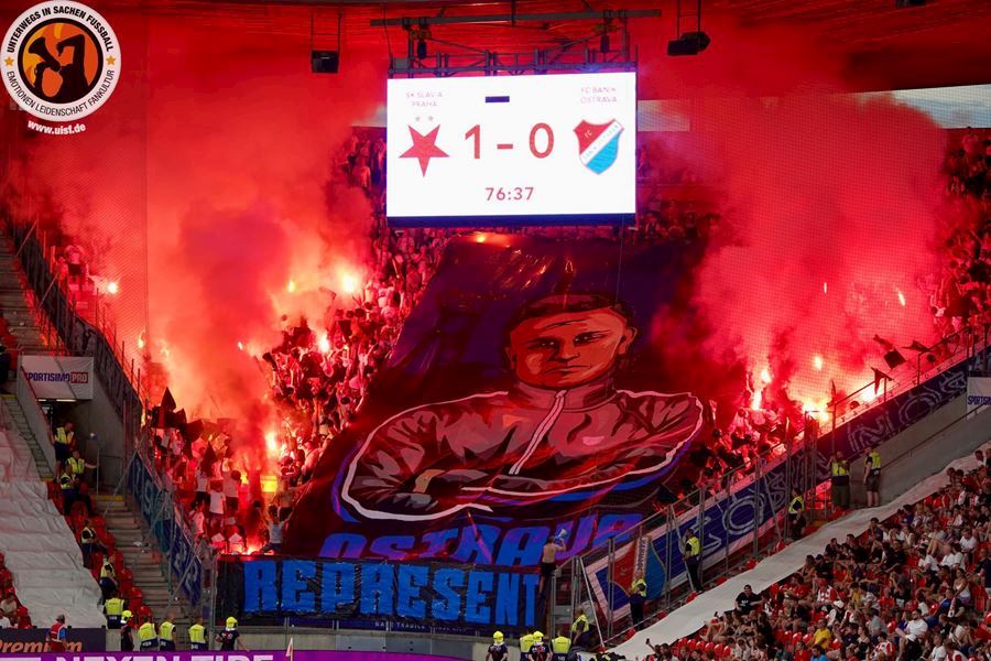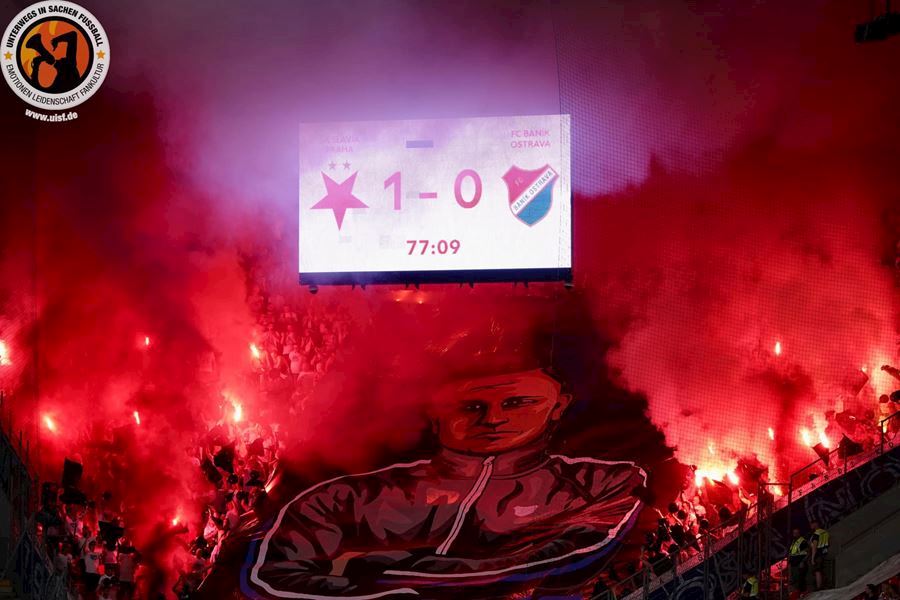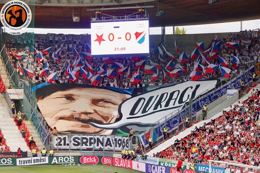 Takto to má vypadat! TS připravila rekordně velkou vlajku, odpálila dýmy a Chachaři si připomněli příjezd zmrdů ze Sovětského svazu v srpnu 1968. Pyro nemohlo chybět. Slavia vyhrála 1:0 a utkání sledovalo 19.164 diváků.