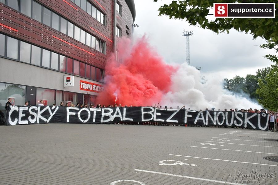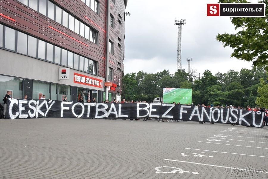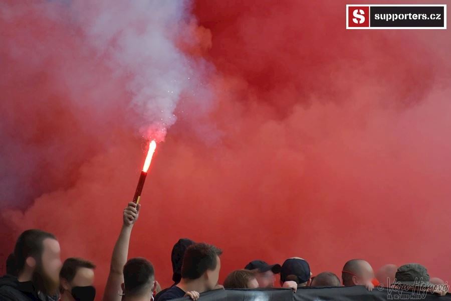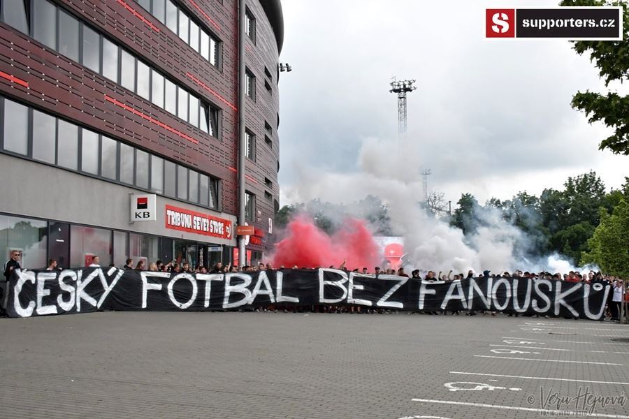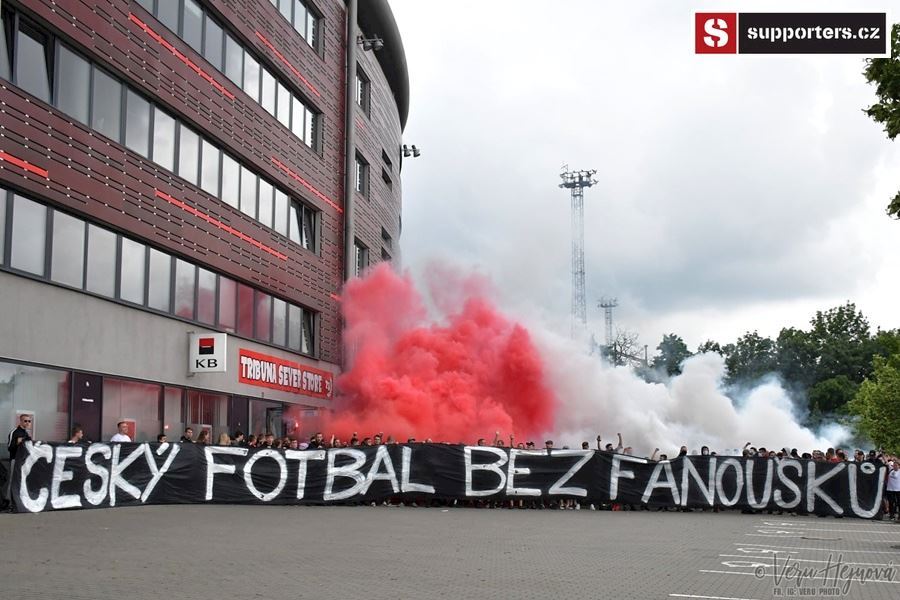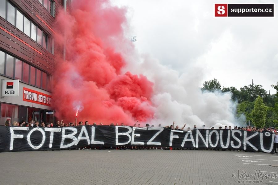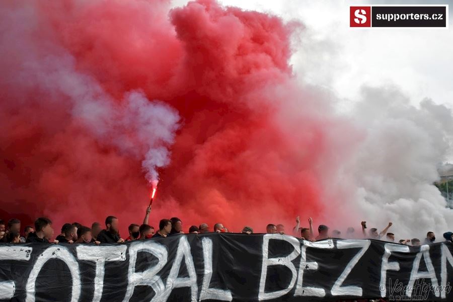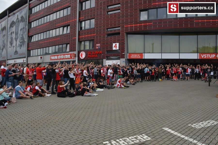 I v posledním ligovém kole se sešli sešívaní příznivci před stadionem v Edenu, kde podporovali Slavii. Při zápase vytahují banner – „Český fotbal bez fanoušků“ a podporu okoření odpálením pyra.