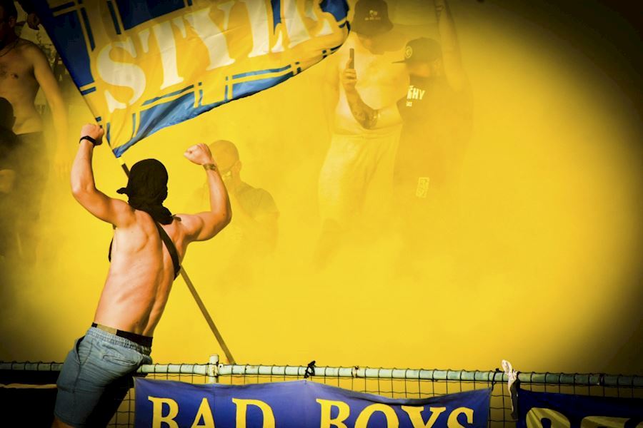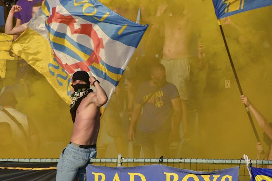 ĎALŠIE ÚSPEŠNÉ PREDSTAVENIE 💛💙 Včera na zápase s Púchovom nechýbali vlajky na tyčiach, žlto-modré dymovnice či transparent pre Gejzu Pulena. Support hlavne v druhom polčase veľmi dobrý. Úvodné kolá sezóny sme tak zvládli na tribúnach aj na ihrisku. 💪