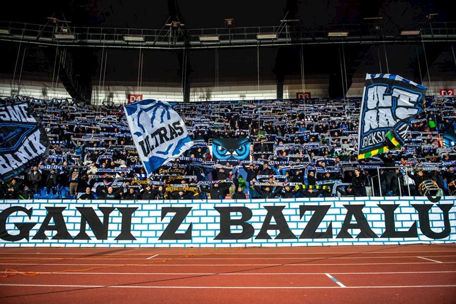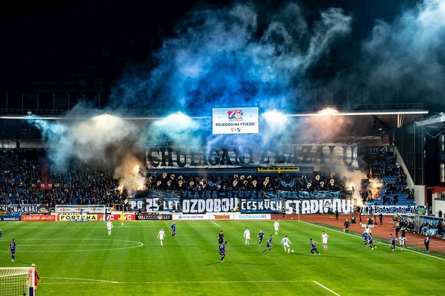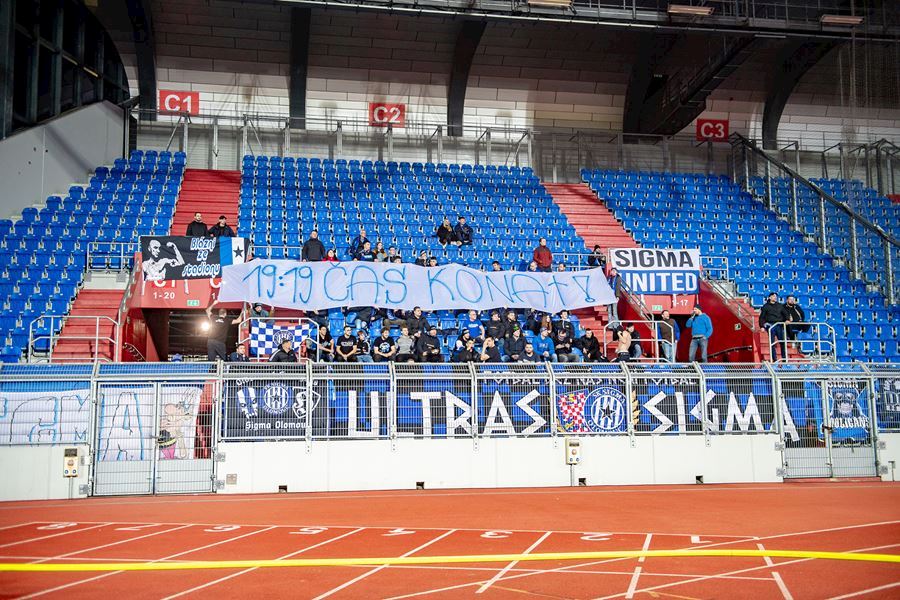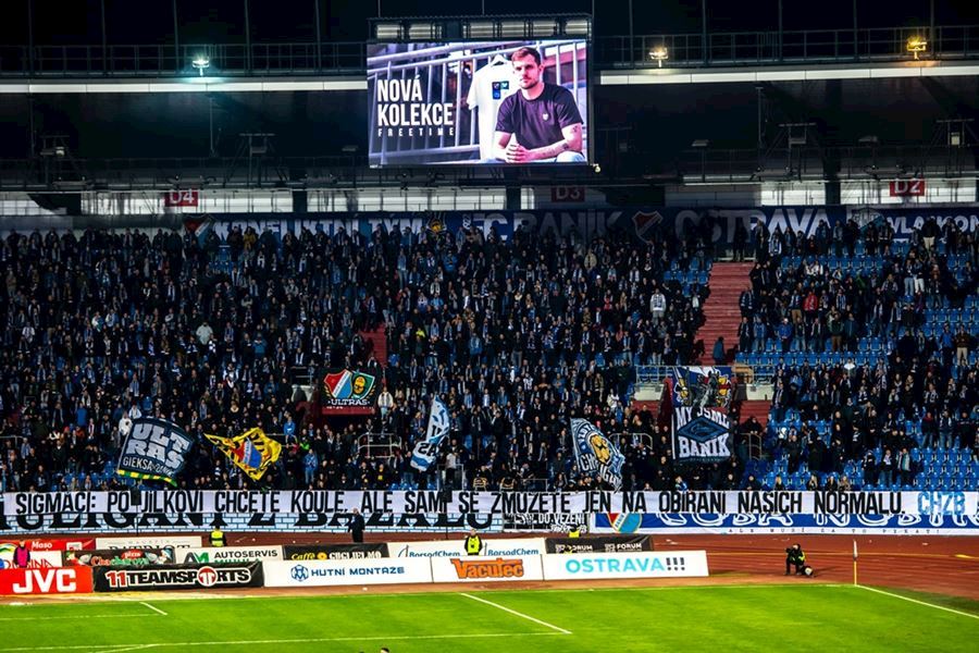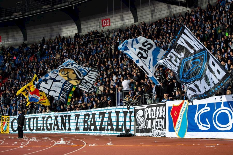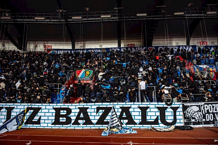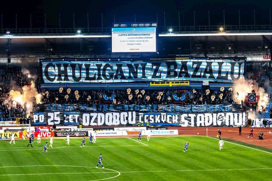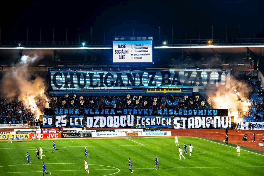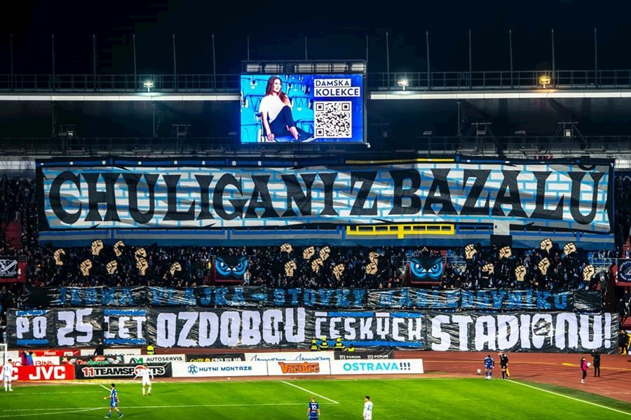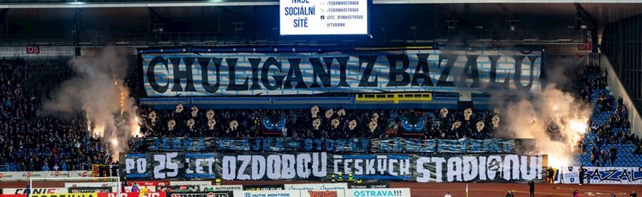 V Ostravě se slavilo alespoň v hledišti... Chuligáni z Bazalů! Jedna vlajka - stovky následovníků. Po 25 let ozdobou českých stadionů. Sigma s nápisy - Čas konat! Čas Odejít!