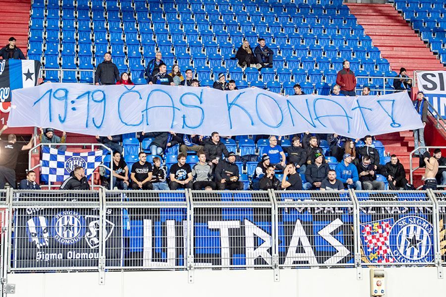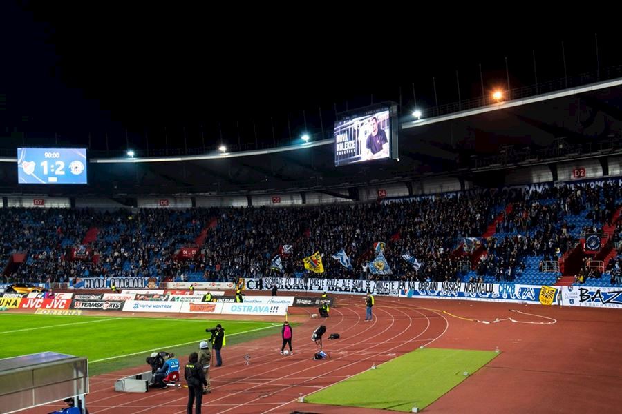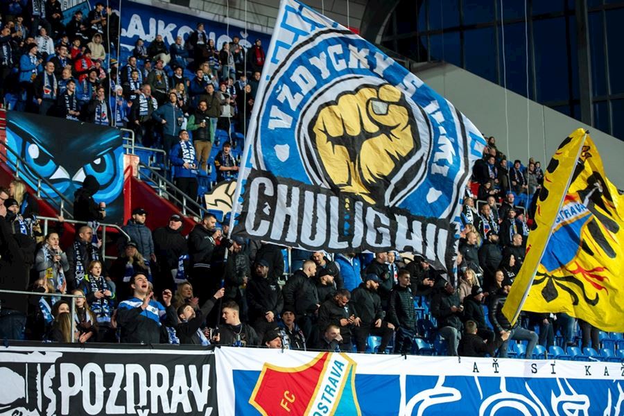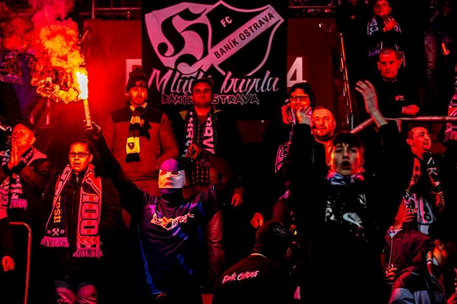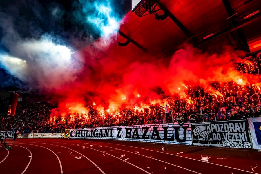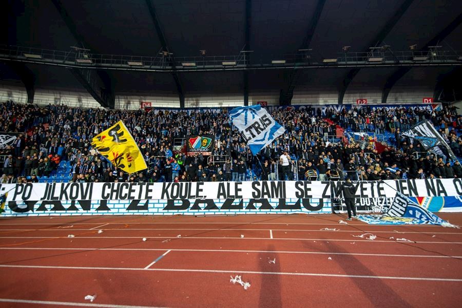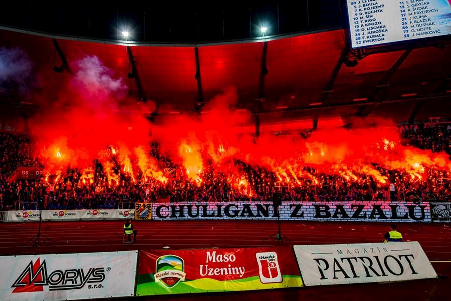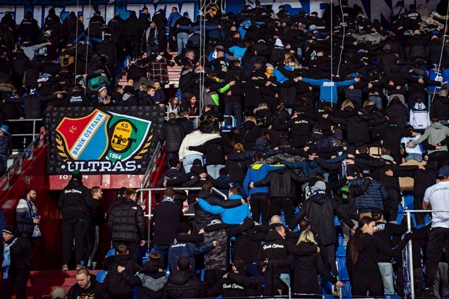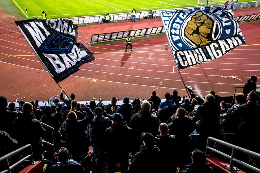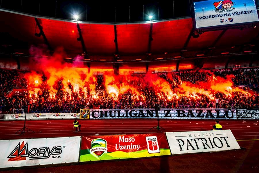 V Ostravě se slavilo alespoň v hledišti... Chuligáni z Bazalů! Jedna vlajka - stovky následovníků. Po 25 let ozdobou českých stadionů. Sigma s nápisy - Čas konat! Čas Odejít!