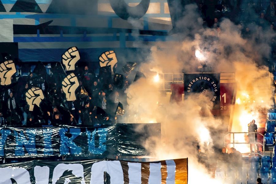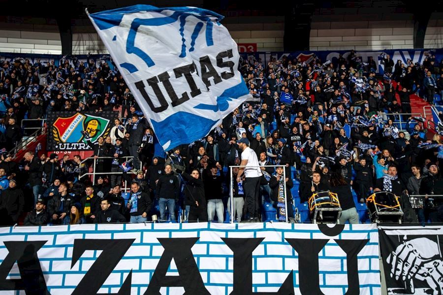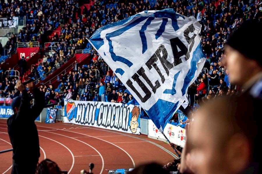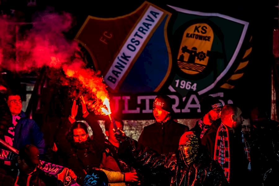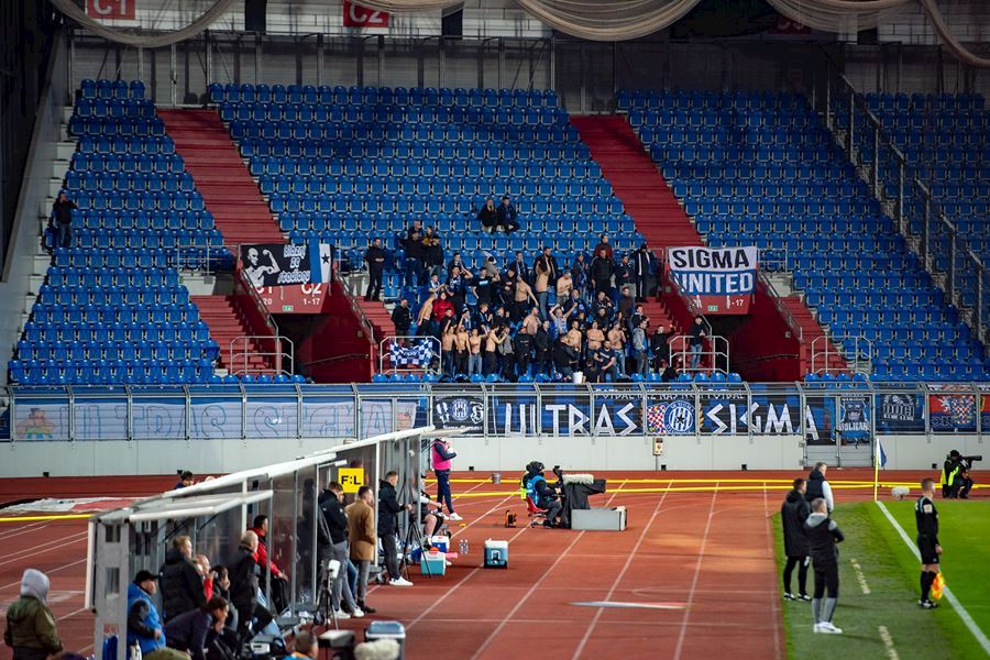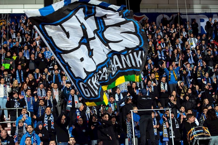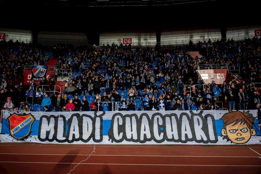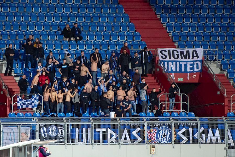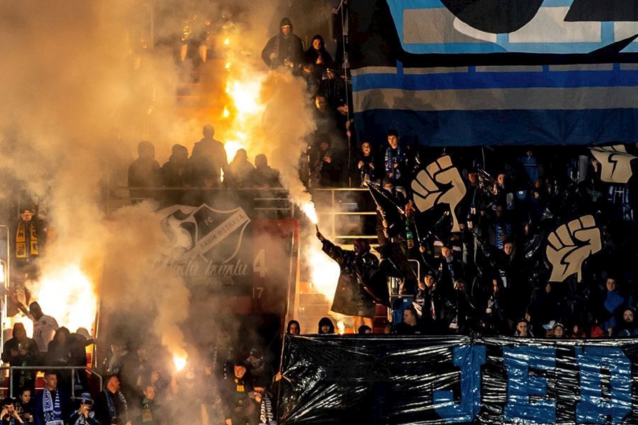 V Ostravě se slavilo alespoň v hledišti... Chuligáni z Bazalů! Jedna vlajka - stovky následovníků. Po 25 let ozdobou českých stadionů. Sigma s nápisy - Čas konat! Čas Odejít!