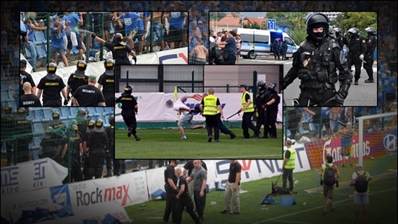Když se domácí gólman nejprve loktem ohnal po jednom z hráčů Baníku, tak začaly směrem k brance lítat různé předměty, následná gesta domácího gólmana směrem k fanoušků hostí pak na dvacet minut utkání přerušila...