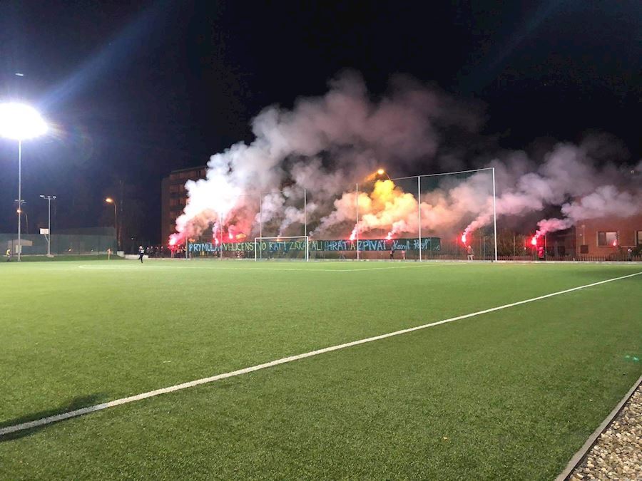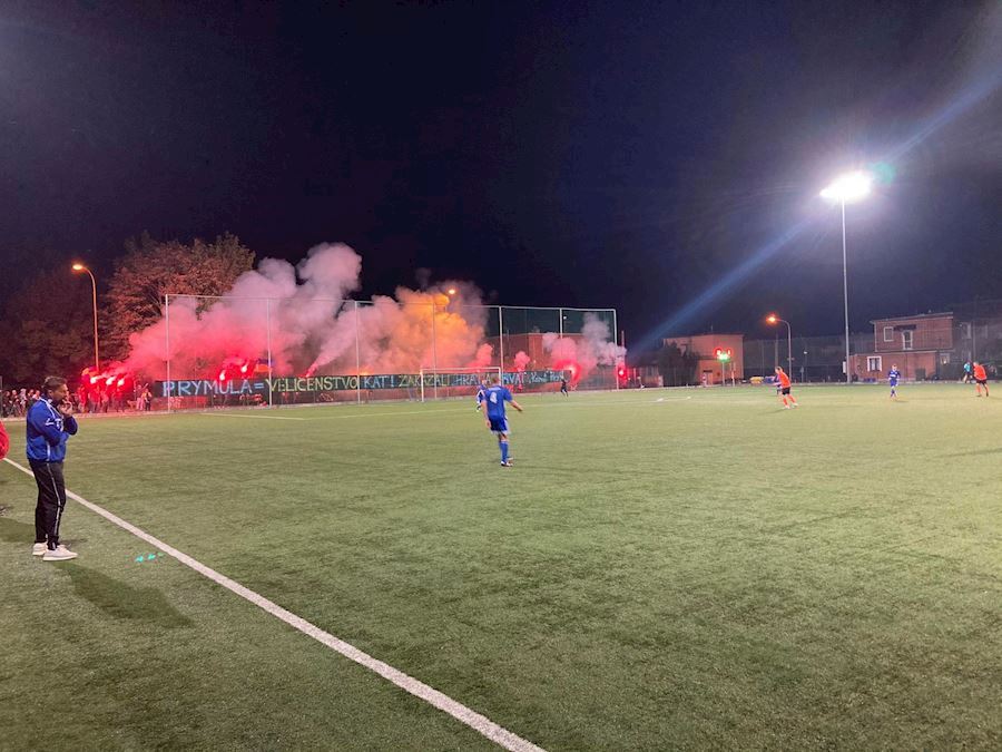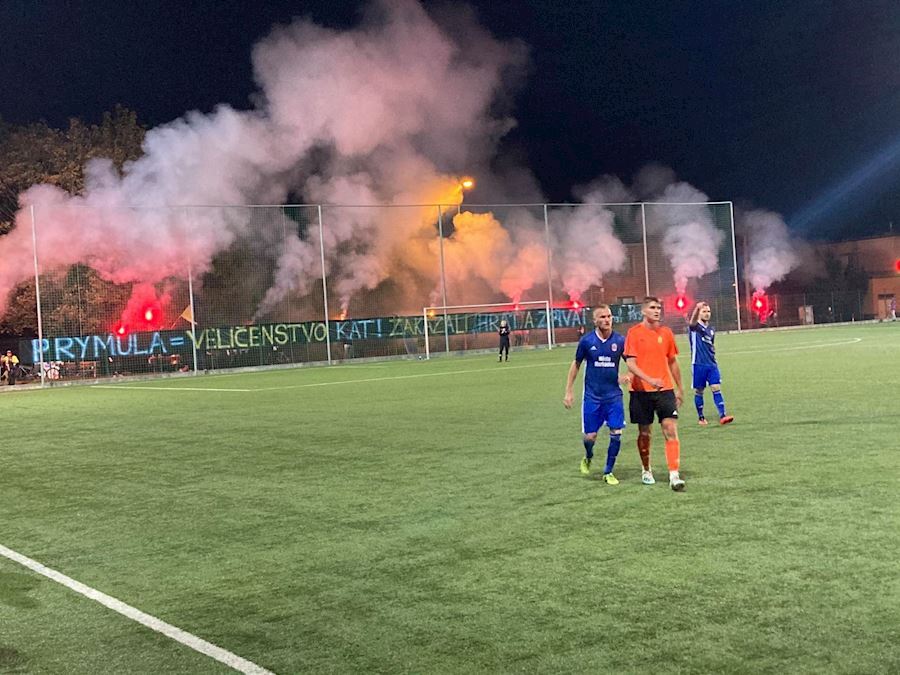 SK Baťov vs. Morkovice. Omezení nemělo vliv na baťovské záploťáky, kteří se sešli na svém obvyklém místě, tedy za plotem. Prezentovali se transparentem “Prymula = Veličenstvo kat! Zakázali hrát a zpívat. Karel Kryl. Choreo navíc bylo doplněno o tradiční pyrotechniku...